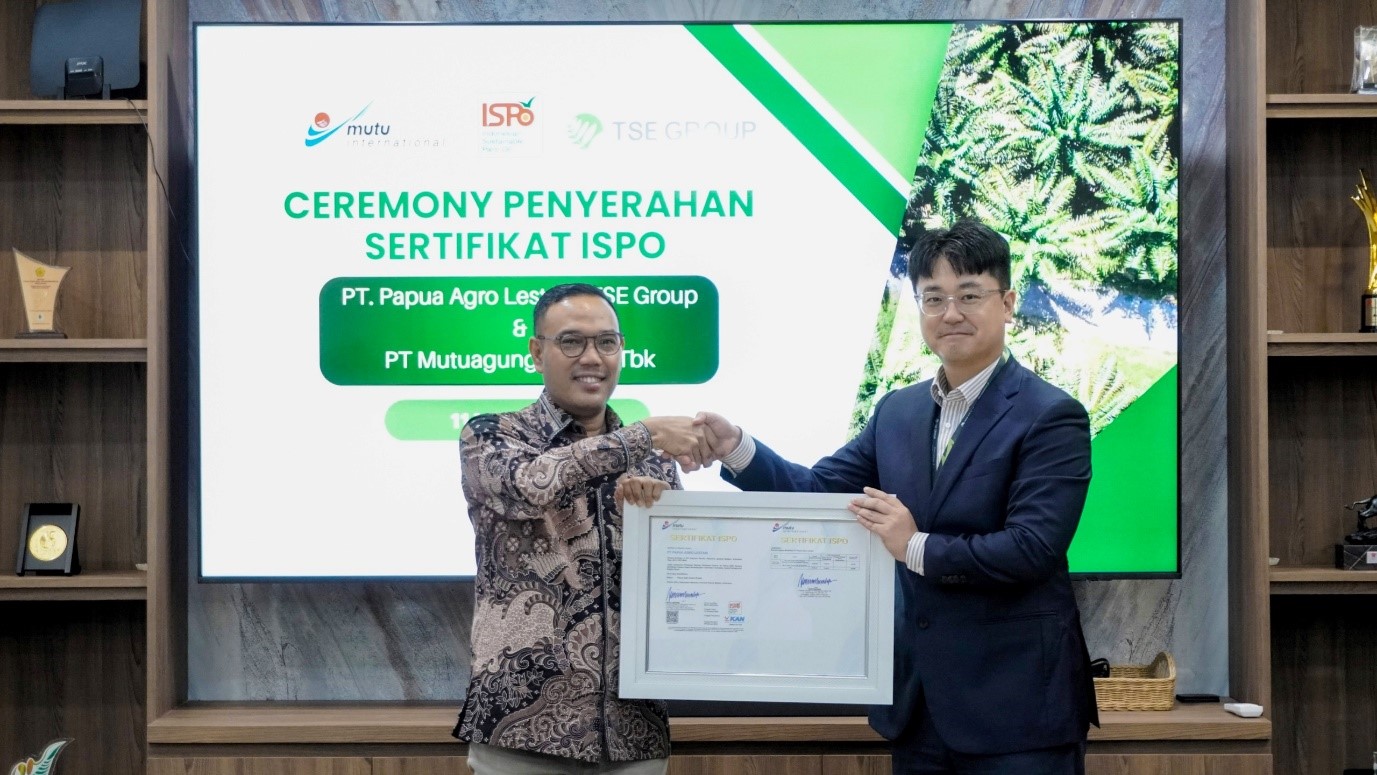 Foto: Penyerahan Sertifikat ISPO PT Papua Agro Lestari dilakukan oleh Direktur Operasional MUTU Internasional (PT Mutuagung Lestari Tbk.) Irham Budiman kepada Mr. Sangjo Woo sebagai perwakilan Direksi Tunas Sawa Erma Group